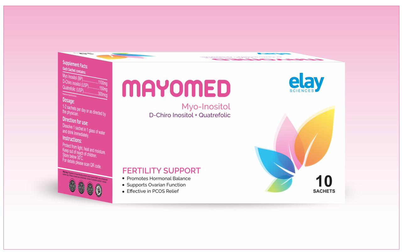Mayomed, by Elay Sciences, is a fertility supplement with D-Chiro Inositol (4000mg), Myo-Inositol (300mg), and Quatrefolic (150mg) per sachet, as shown in the image with a pack of 10 sachets. The label highlights hormonal balance and ovarian health with a floral design.